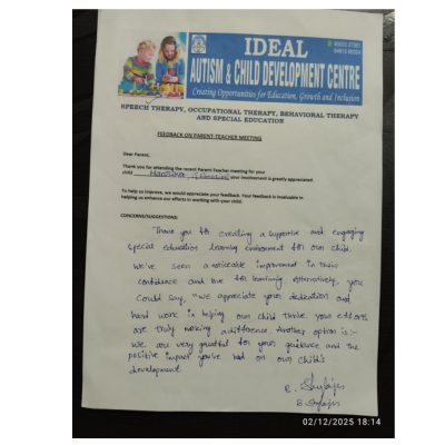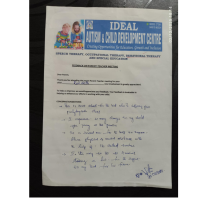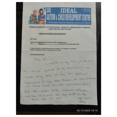 IDEAL Autism & Child Development Rehabilitation Centre has brought remarkable improvements in my daughter’s speech and communication. The therapists are patient, kind, and truly understand children's needs.
